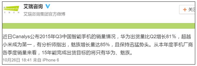 2015年又将接近尾声,除了迎接双11大促之外,不少手机厂商也开始总结这一年中收获的经验。近日,国内知名咨询机构艾瑞咨询,在微博上对今年国