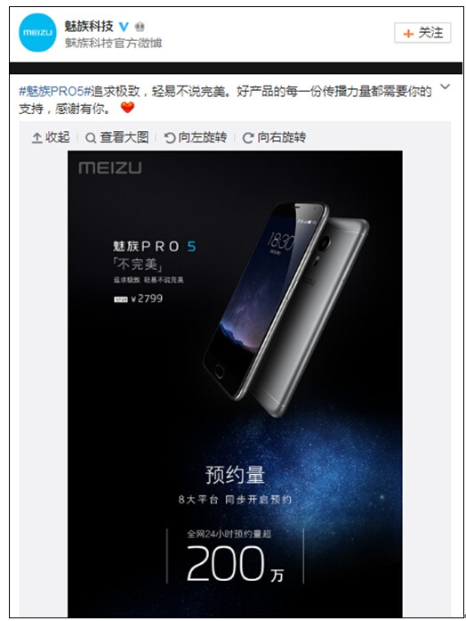 创魅族手机价格新高的全新高端子品牌首款产品PRO 5,在9月23日下午2:30以2799元的最低售价发布后,交出了全网24小时预约量超200万的漂亮成绩。