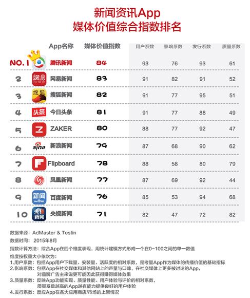 近日,国内最权威的新闻资讯App媒体价值综合指数排名正式推出。营销数据技术公司AdMaster(精硕科技)携手全球最大的App及手游云测试平台Testin...