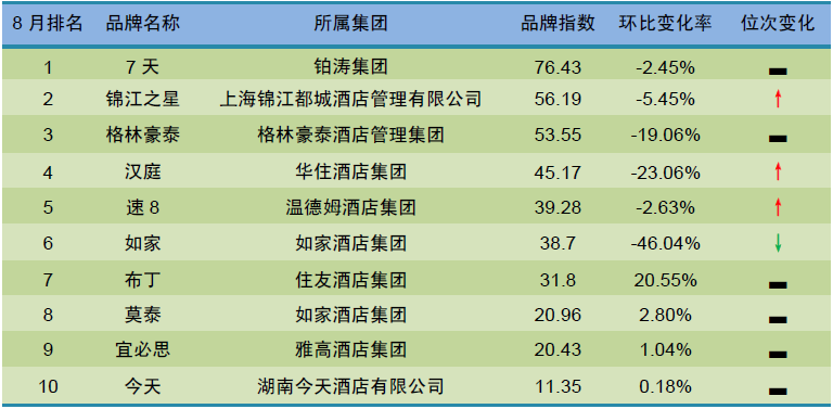 2015年8月,根据迈点旅游研究院(MTA)对经济型酒店品牌品牌指数的不完全统计,本月经济型酒店品牌风云榜TOP10依次是7天、锦江之星、格林豪泰