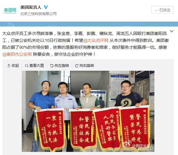 今天下午1点30分,“美团发言人”微博发出一条消息,透露大众点评5名员工因多次寻衅滋事,殴打美团衡阳员工而被公安机关处以10日行政拘留。