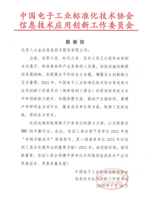 近日,人大金仓获中国电子工业标准化技术协会信息技术应用创新工作委员会(简称“信创工委会”)授予2022年度“卓越贡献成员”荣誉称号,这是