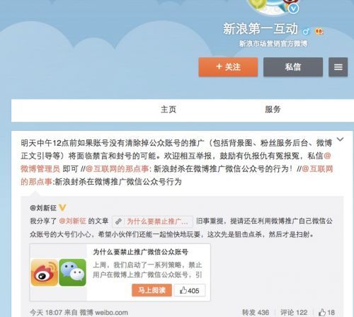 腾讯的滴滴搞阿里的快的,阿里的微博马上还以颜色,贵圈打架真猛!昨日新浪微博禁止用户利用微博推广微信公众账号,否则将封号。