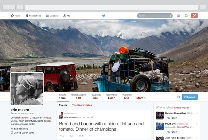 改版后的 Twitter 更加注重视觉效果,用户的头像以及头像后的封面图片也得到突出,在样式上看起来在向 Facebook 和 Google+ 靠拢。