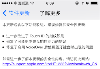 今天苹果放出了 iOS 7.1.1 更新(已通过 OTA 推送):1. 进一步改进了 Touch ID 的指纹识别;2. 修复了可能影响键盘响应能力的错误