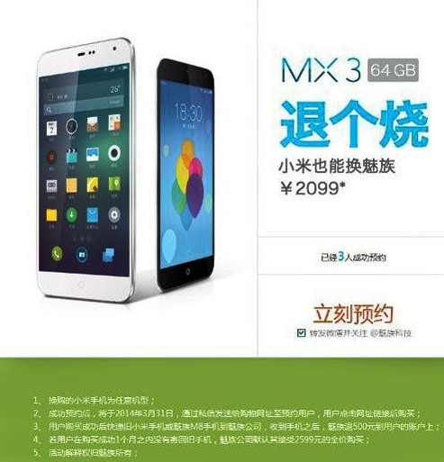 3月25日消息,据媒体报道,日前在魅族论坛上有消息称,魅族将再次开启MX3换购活动,而此次换购支持的手机是小米。