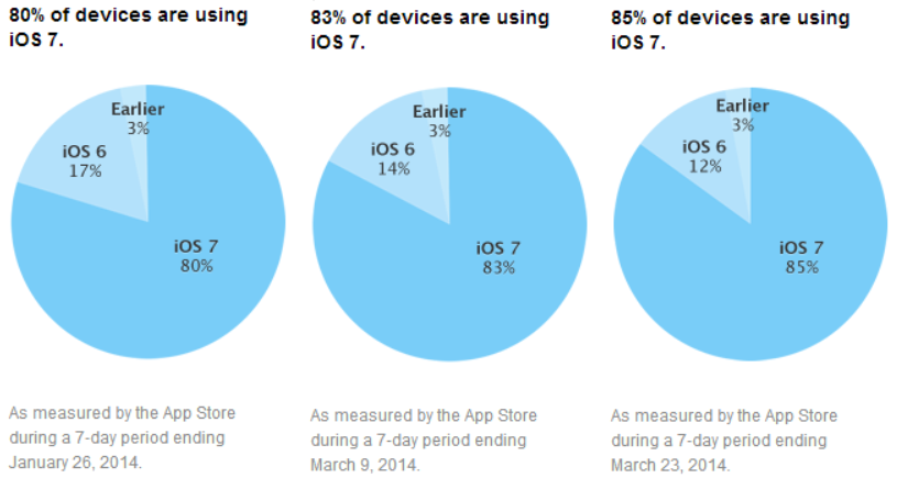 从苹果给出的图来看,目前 iOS 7 的市场普及度在 85%,iOS 6 则下降至 14%.对比此前的数据,iOS 7 的用户一直在不断增长,目前已从今年 1 月 26 日的 80%。