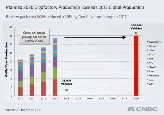 二月末,特斯拉宣布将于2017年建成千兆电池工厂(Gigafactory),该工厂将成为全球最大的电池工厂,其产能将比 2013 年全球电池产量还要高。