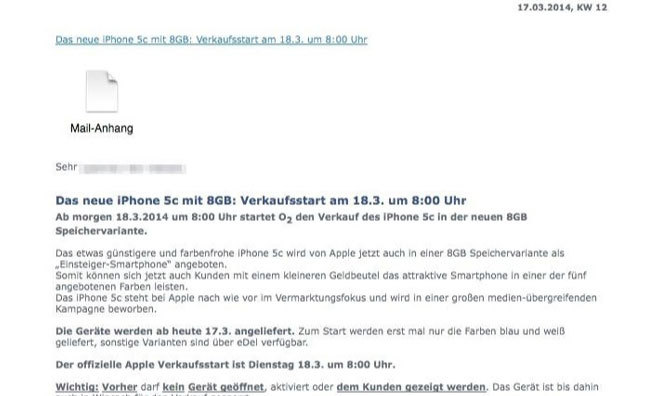 德国运营商 o2 的内部邮件显示,苹果打算在今天推出 8G 版的 iPhone 5c,售价 509 欧元,比 16G 版的 iPhone 5c 便宜 60 欧元。