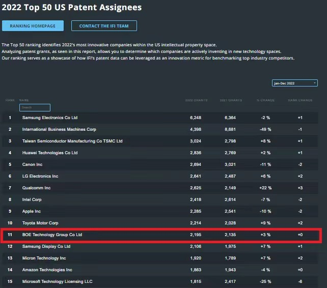 BOE(京东方)位列2022 IFI 专利授权排行榜全球第11位 科技创新引领高质量发展
