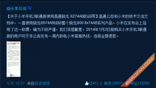小米如约开售了小米3联通版手机,不过随着手机陆续抵达用户手中,不少用户发现原本宣称的高通骁龙MSM8974AB处理器变为了高通骁龙MSM8274AB处理