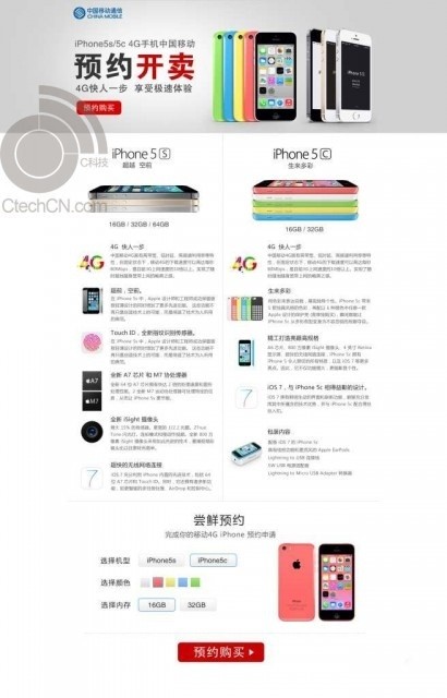 12月2日消息,上周末,有网友在微博中爆料出一张关于中国移动预定iPhone 5S/5C是我页面,图片中显示,iPhone 5S/5C移动版将在12月18日正式开售。