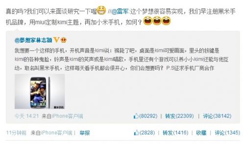 雷军发表微博并艾特林志颖,称黑米手机已经被`小米科技注册,并且声称可以与林志颖合作,采用MIUI系统,一起推出符合林志颖需求的定制机型。