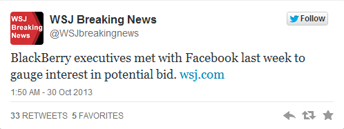 Facebook 也对黑莓感兴趣?据华尔街日报消息,上周,黑莓安排代表至加州与 Facebook 不知名高管会面,讨论收购事宜。