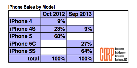 根据Consumer Intelligence Research Partners调查的苹果最新销售数据显示,iPhone 5s 占据了 64% 的销量,而 iPhone 5c 只有 27%
