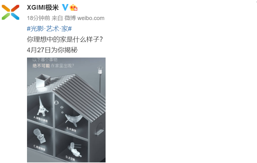 极米科技官方微博今天发布了一则海报,宣布将于4月27日将推出新的产品。