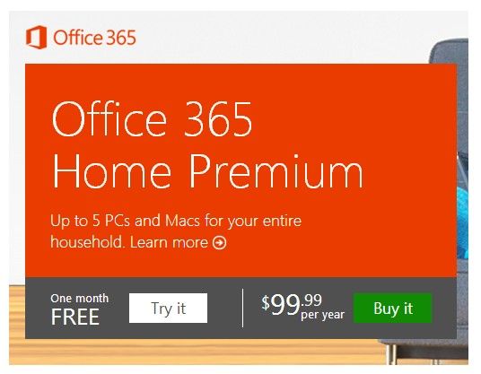 微软于今年1月29日推出了Office 365家庭高级版订阅服务,每年收费为100美元。Office 365家庭高级版允许用户在5台电脑或者Macs上安装使用,同