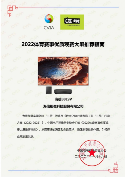 近日,中国电子视像行业协会联合京东家电举办的《2022体育赛事优质观赛大屏推荐指南》评选结果公布,海信激光电视88L9V等产品被中国电子视像行业