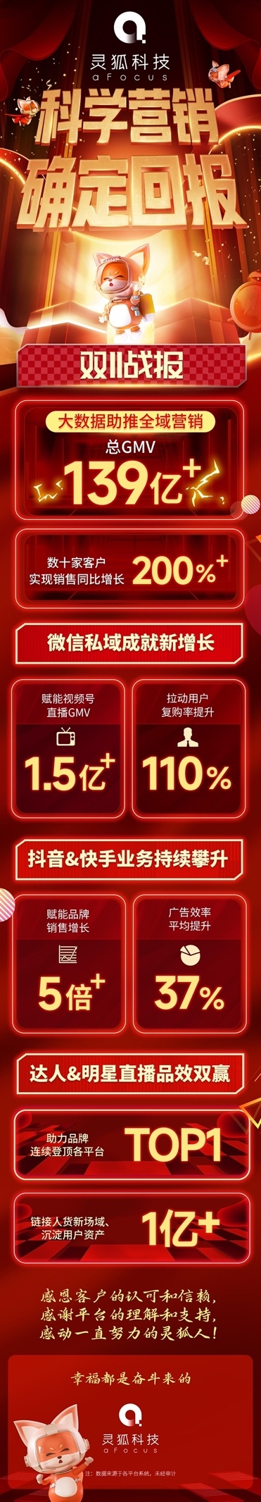 2022年11月18日,灵狐科技召开2022年度双11战役总结表彰大会,对今年双11大促中表现突出的15个优秀项目和17名优秀个人进行了嘉奖,并对此次战役进