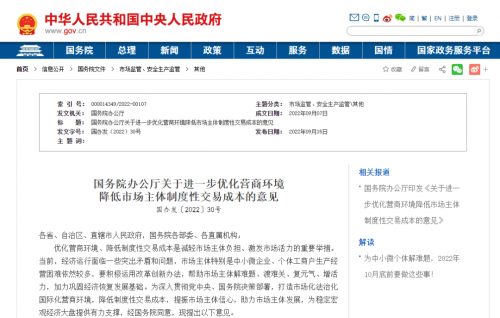 近日,国务院办公厅印发《关于进一步优化营商环境降低市场主体制度性交易成本的意见》(以下简称《意见》),指出: