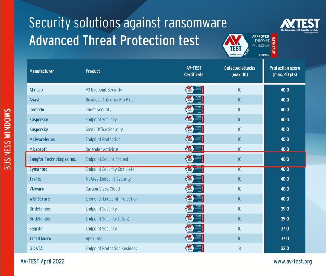 今年4月,独立IT安全机构AV-TEST发布了在其针对勒索软件防护的高级威胁防护的测试结果,在该与多个国外知名品牌杀软同台的测试中,深信服满分