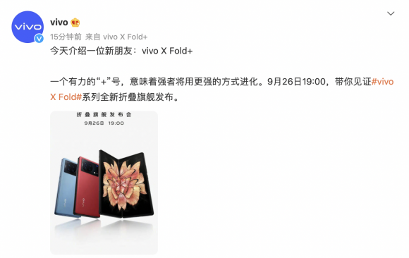 今天,vivo官方微博正式宣布,新款折叠屏手机X Fold+将于9月26日正式发布。在此之前, 已有媒体曝光X Fold+部分配置,包括将会新增华夏红配