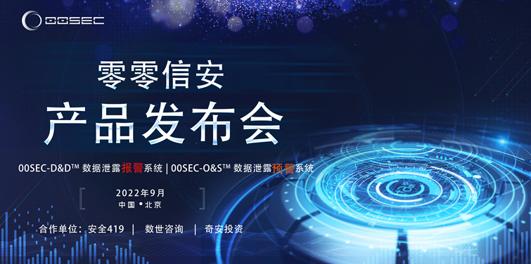 2022年9月5日,外部攻击面管理厂商零零信安在京召开新品发布会,正式对外发布旗下00SEC-D&D数据泄露报警系统,另外一款名为00SEC-O&S数据泄露