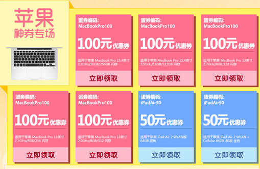 值得注意的是,这次参加活动的苹果产品很多,特别开出了苹果蛋券专区。iPhone 6 16GB在6月17日秒杀中券后价格只要4768元。还有新品的MacBook Pro 15.4英寸更是可以用100元立减优惠券,券后价12888元。