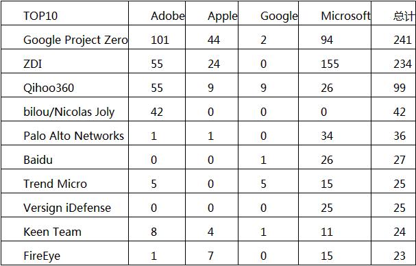 Google Project Zero当之无愧夺魁。作为Google旗下精英团队,Google Project Zero不光扞卫着Google的安全,也用实际行动促进各大软件厂商提升产品安全性;排名第二的ZDI(HP’s Zero Day Initiative)与榜首的漏洞致谢数量差距不大,但ZDI的漏洞大多来自收购而不是靠自身实力挖掘;排名第四的bilou/Nicolas Joly在一年间转战效力于VUPEN、Google Project Zero和微软,因此单独列出。