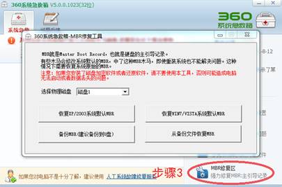 二、点击“360系统急救箱”界面右下角的“MBR修复区”,根据自己电脑操作系统的版本恢复默认MBR即可。