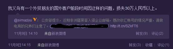 近日,有义乌网民在新浪微博表示,自己有朋友曾被骗取30万元货款。瑞星安全专家指出,针对此类诈骗,网商应该提高警惕,在防范病毒木马的同时,要完善自己的付款流程,要求用户在付款前要电话确认账户信息等。公安部刑事侦查局发布警示,日前有非洲裔黑客入侵外贸企业的电子邮箱,利用窃取的邮箱帐号篡改收款帐号,套取国外客户的汇款。