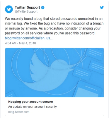 继Facebook数据泄露事件之后,另一大社交软件Twitter竟也爆出泄露用户密码。