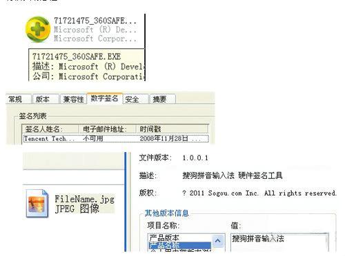 “四不像”病毒的做法有些可笑,病毒采用360安全卫士图标,版本伪装成微软,数字签名盗用腾讯的。“四不像” 病毒运行后会释放出来一个DLL文