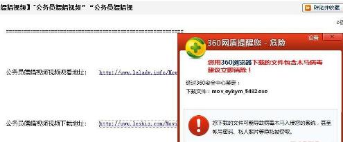 根据360安全中心监测:最近24小时内,互联网上新增了1300多个与《公务员嫖娼视频》相关的欺诈网页,利用假视频下载、安装播放器插件等名义将木