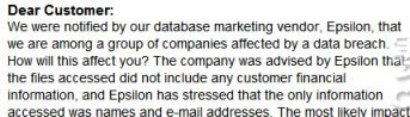 今年4月初发生全球最大电子邮件营销公司被黑事件,多家大型企业名单外泄事件。其Epsilon表示,该公司发现黑客侵入系统,部分客户数据可能遭窃取。