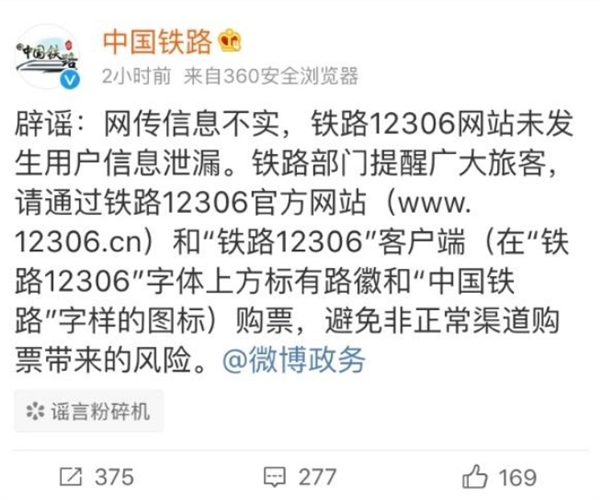 中国铁路总公司官方微博@中国铁路发布微博称:“辟谣:网传信息不实,铁路12306网站未发生用户信息泄漏。”网曝12306信息泄露中国铁路辟谣:信