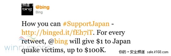 日本发生特大地震,全球各地都纷纷伸出了援助之手,微软Bing搜索团队也在官方微博上表示将捐献爱心,不过其采用的方法却让人觉得是在“利用”