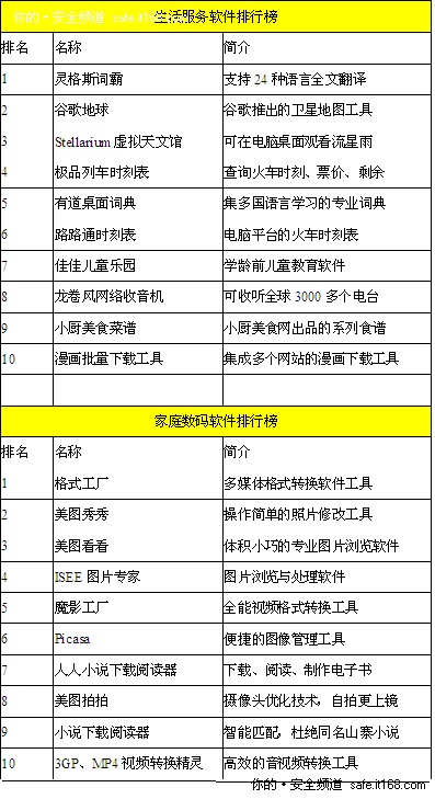 近日,由360软件管家携手《法制晚报》举办的“2011新春网民常用软件评选”活动结果揭晓,灵格斯词霸、多媒体格式工厂、酷狗音乐、植物大战僵尸