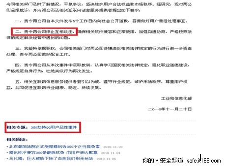11月21日晚,工信部正式发表通告,对360与腾讯两家公司提出批评,并责令两家公司停止互相攻击,恢复软件相互兼容,保证用户使用。自此,长达数