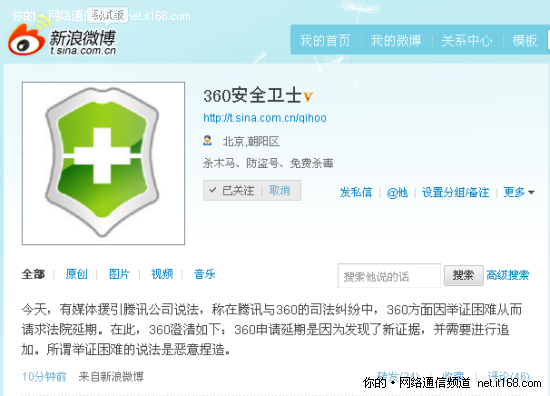 11月25日晚间消息,针对有媒体援引腾讯公司说法,称在腾讯与360的司法纠纷中,360(微博)方面因举证困难从而请求法院延期,360通过其新浪微博(h
