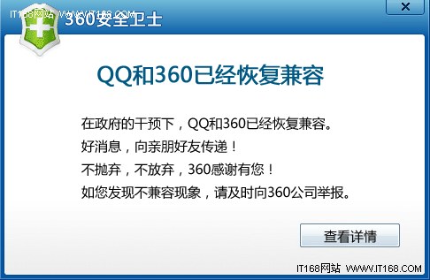 今天,360通过弹窗发布了3Q大战的最终结果,“在政府的干预下,QQ和360已经实现兼容”。
