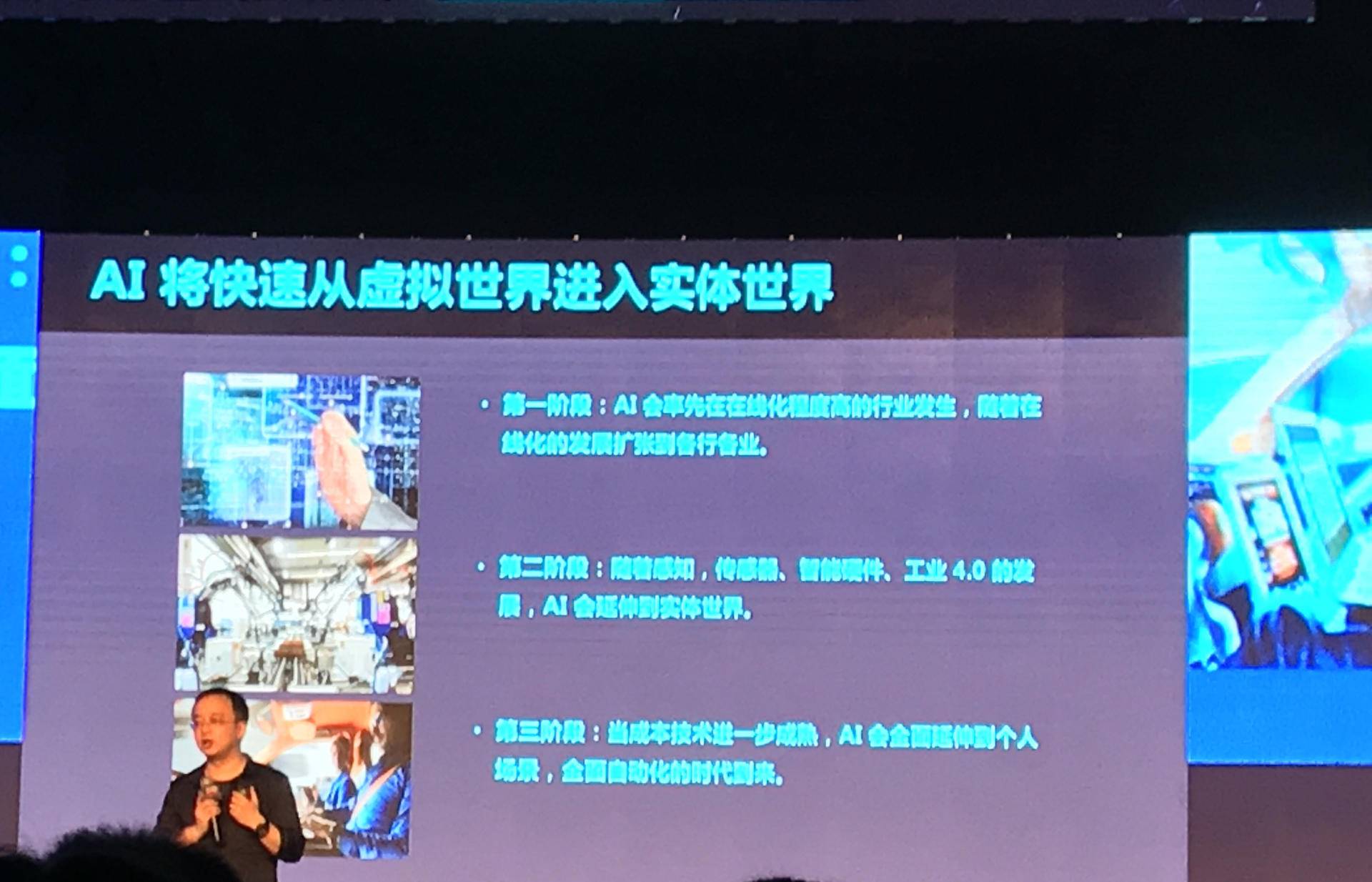 阶段二:会稍晚一些的:我们的判断会花到两三年或者三到五年的时间。那么这样一个阶段,是人工智能从我们虚拟世界(线上)向现实世界(线下)不断扩展的阶段。比如现在所有做安防的公司,所有依靠人脸识别、形体识别,从个人身份识别完成安防体验的公司,他们其实已经为线上和线下通过传感器构架沟通的渠道。