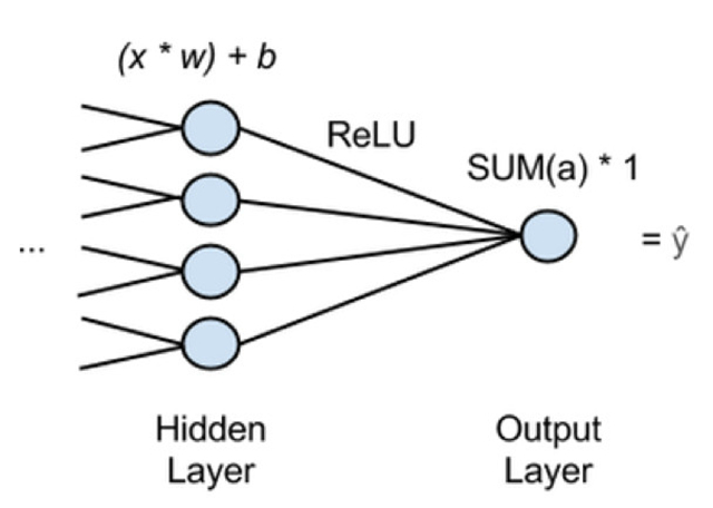 在上图中,“x”是输入,特征从前一层神经元传播而来。到最后隐藏层的每个神经元,有很多’x’会喂进来,每个’x’,乘以相应的权重w。对于偏置,乘积求和后加上偏置,然后输入到激活函数。激活函数常用的是ReLU(修正线性单元),因为它不会像sigmoid激活函数在浅层梯度膨胀。ReLU在隐藏层输出的激活值a,经过求和后成为输出层的输出。这暗示:一个神经网络用做回归时只有一个输出节点。这个节点把激活值求和后乘以1向量。网络的估计值,‘y帕’作为结果。‘Y帕’是所有’x’映射出来的独立变量。你可以这样用神经网络得到与‘x’(多个非独立向量)相关的函数,可以求出你要预测的’y'(独立变量)。