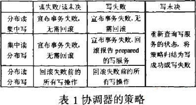 对于协调器而言,参与者有两种操作类型(读和写),以及三种结果状态:准备好(prepared),表明执行成功;失败(failed),需要回滚或补偿;未决(indoubt),协调器失去与参与者的联系,参与者的执行结果未知。而参与者的执行结果仪有准备好和失败两种类型,而由底层业务系统保证其域内的事务支持特性。全部的参与者状态报告均为prepared时事务执行成功;如果存在其他状态,协调器采取采取以下策略: