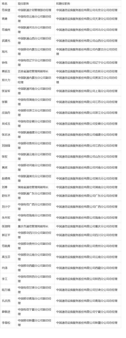 备受业界关注的中国通信设施服务股份有限公司(俗称铁塔公司)进入运营倒计时阶段。腾讯科技从内部可靠渠道获悉,铁塔公司31位省分公司总经理
