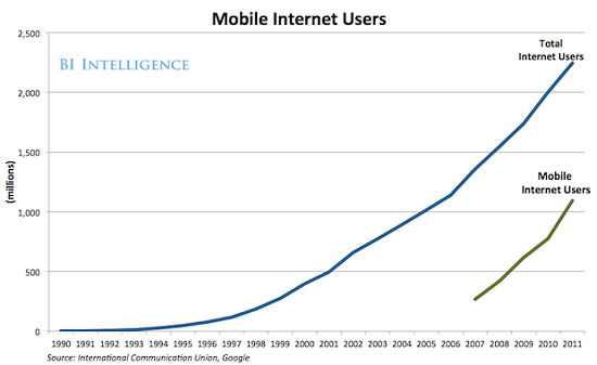 数据显示,2007年全球互联网用户数为2.68亿,2011年底为11亿,而仅仅过去9个月,已经攀升到了15亿,其增长速度远远高于桌面互联网用户增长速度。