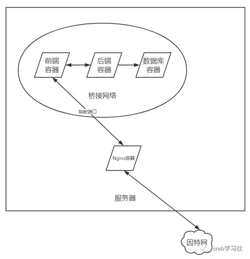 对于需要对子网外部提供访问的容器,可以将端口映射到服务器主机上。整个结构大致如下:
