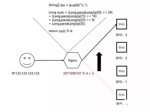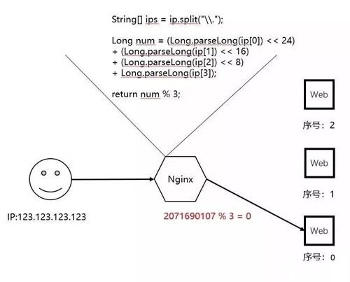 以nginx中的ip_hash策略来举个例子。因为我们认为正常情况下用户的ip不会在短时间内发生变化,所以当我们选择使用ip_hash策略进行负载均衡时,意味着期望同一个用户能够一直访问到同一台服务器上,就像下图这样,图中的hash函数是最简单的随意举例。