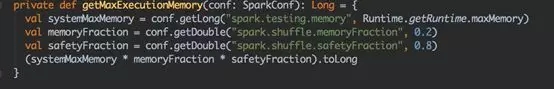 从getMaxExecutironMemory方法可知,每个executor分配给execution的内存为:Execution Memory = systemMaxMemory *memoryFraction(默认0.2) * safetyFraction(默认0.8), 默认为 executor 最大可用内存 * 0.16。