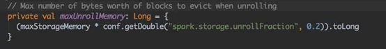 注意:这个20%的空间并不是静态保留的,而是通过drop掉内存中的数据block来分配的。如果unroll失败了,spark会把这部分数据evict 到硬盘。